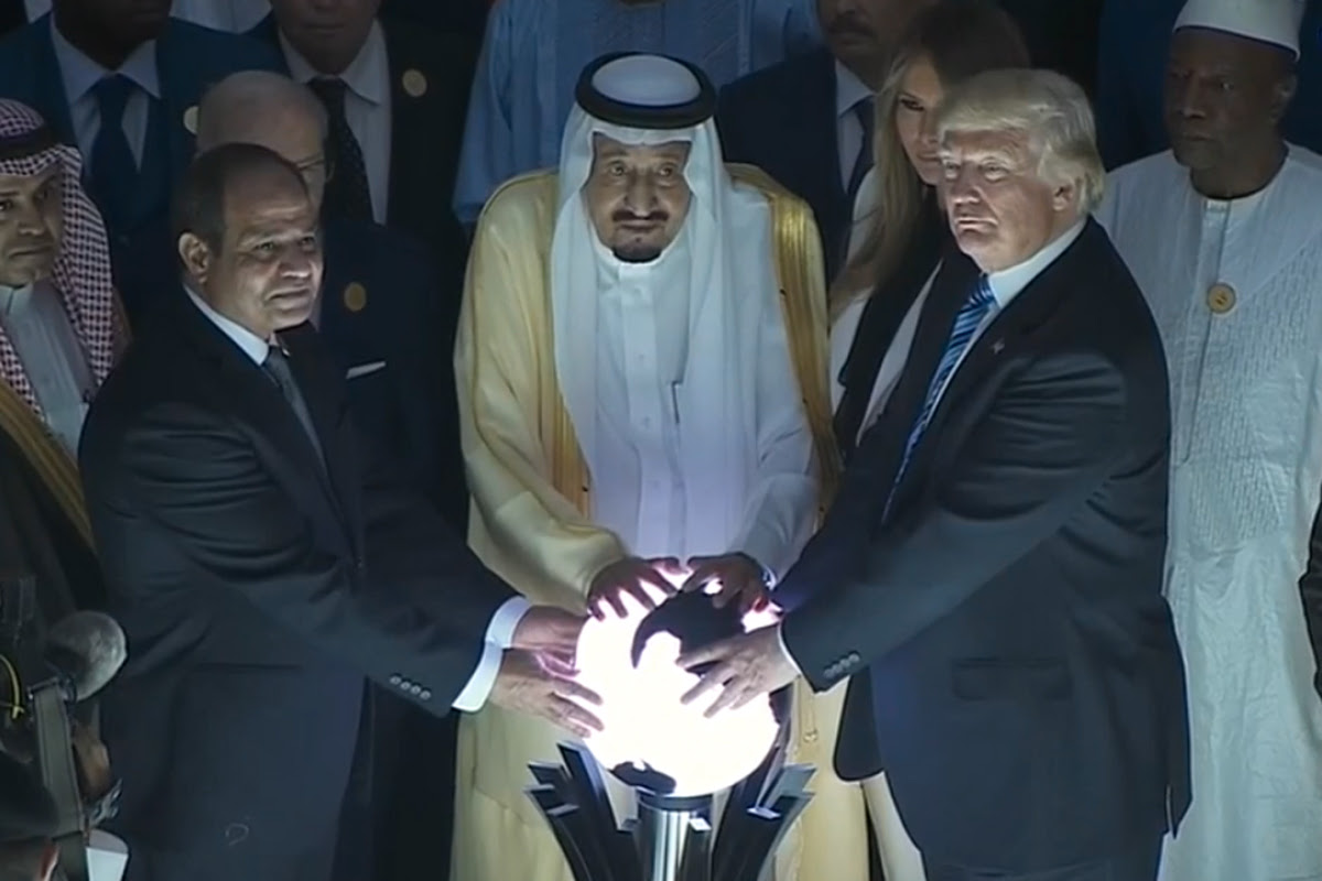 | Le président égyptien Abdel Fattah el-Sisi (à gauche), le roi Salman d'Arabie Saoudite (au centre) et le président Trump (à droite) scellent l'alliance contre le Qatar et le "Deep State" |