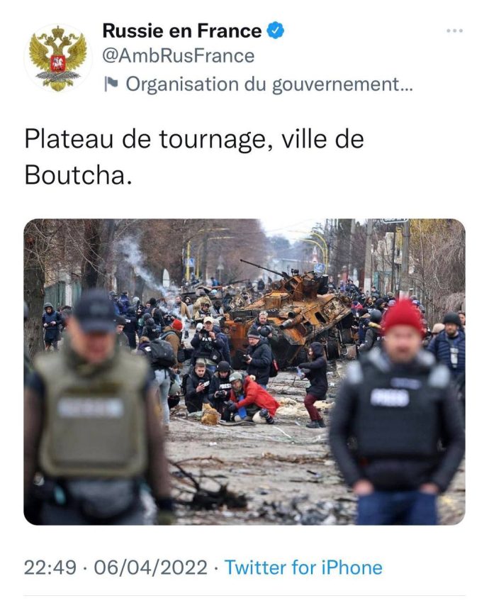 Ambassade Russe en France présente son Tweet avec comme phrase : "plateau de tournage, ville de Boutcha":
