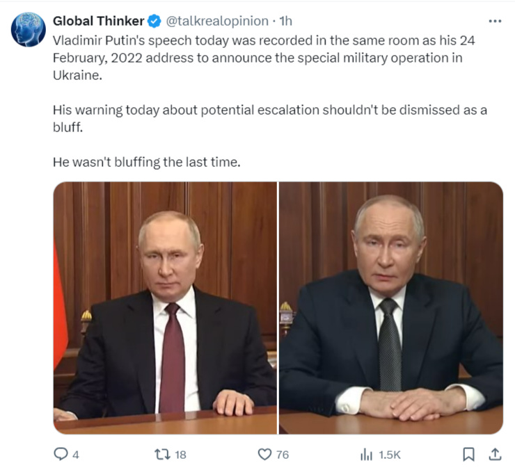 Ils prétendent que Poutine est opposé à l’escalade, les « lignes rouges » étant soi-disant franchies à maintes reprises. En réalité, les observateurs avisés constatent que Poutine agit de manière assez ordonnée :