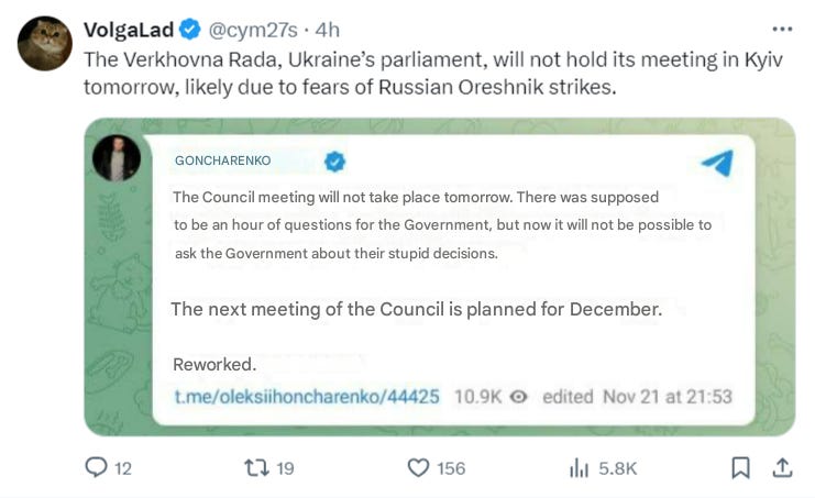 Revenons maintenant aux événements d’aujourd’hui pour conclure. Un député ukrainien de la Rada affirme que de nouvelles informations indiquent que la Russie va bientôt frapper la Verkhovna Rada elle-même :