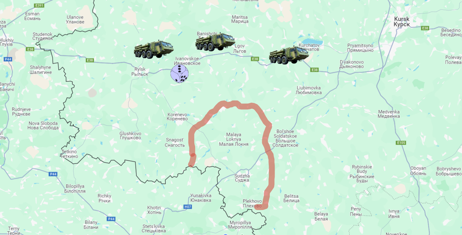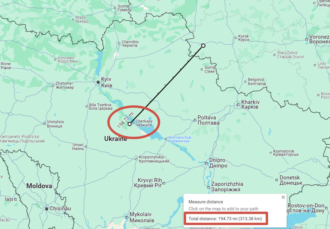Vous voyez, la variante exportée par l’Ukraine, les Storm Shadows, est censée parcourir 300 km au maximum, ce qui signifie que pour atteindre le complexe de Koursk, les avions ont probablement lancé les missiles à une distance maximale, au-dessus du fleuve Dniepr, en toute sécurité, hors de portée des missiles antiaériens russes :