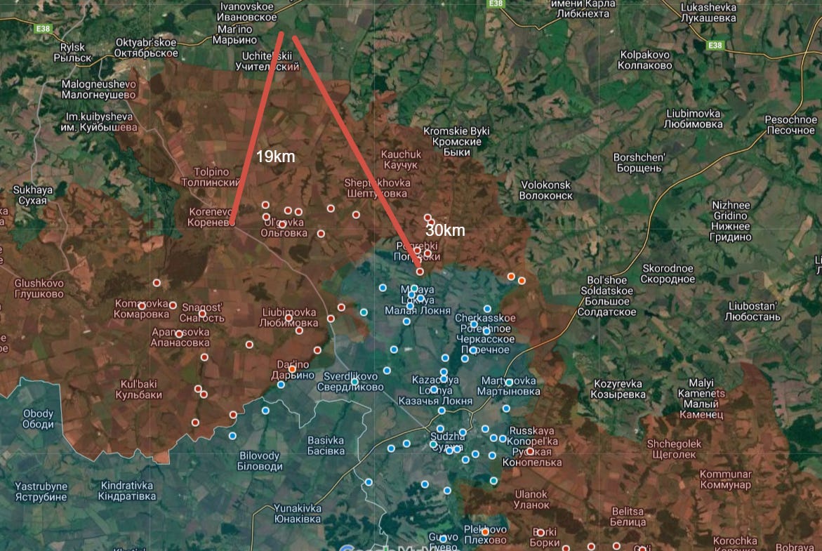 L’emplacement est précisément à 19 km de Korenevo, où de violents combats avaient déjà eu lieu dans la région de Koursk, et à 30 km de Pogrebki, la ligne de front la plus intense actuellement :