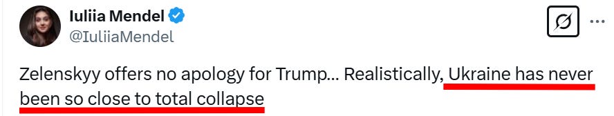 Et enfin, la plus catastrophique de toutes : l’affirmation selon laquelle Trump envisagerait désormais de couper toute l’aide ukrainienne :