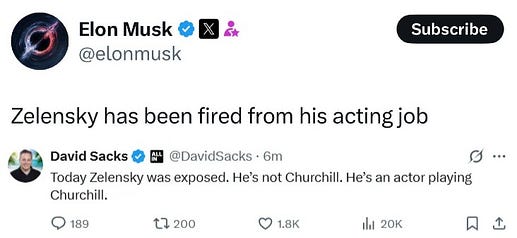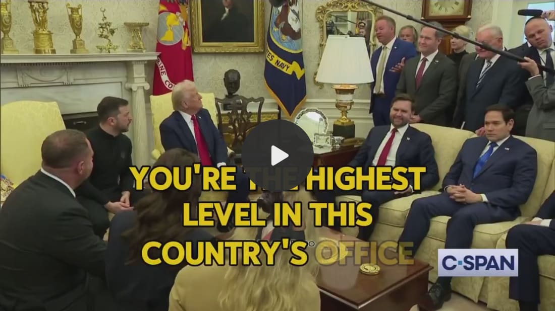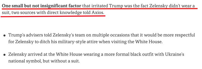 Tout d’abord, un bref résumé : tout a commencé lorsque Zelensky s’est arrêté à la Maison Blanche, avec Trump taquinant immédiatement le dirigeant en disgrâce à propos de son choix vestimentaire non professionnel :