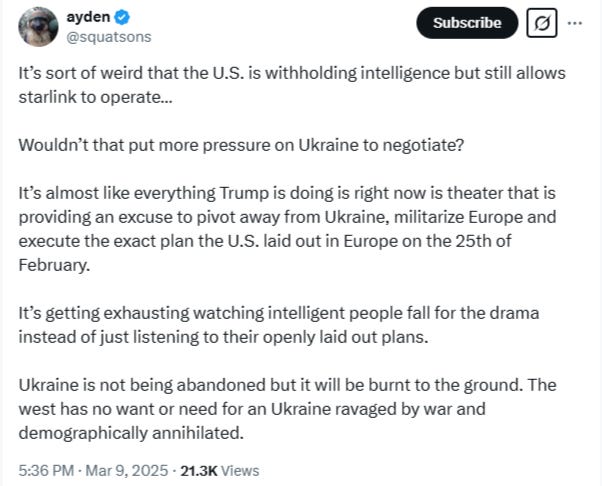 Comme il le mentionne, l’Ukraine essaie maintenant de se réconcilier avec Trump, les deux étant prêts à se rencontrer cette semaine en Arabie saoudite pour une conciliation. Le but, du côté de Trump, est de « jauger » dans quelle mesure Zelensky est désormais disposé à la paix, c’est-à-dire s’il a changé d’avis après avoir reçu une tape sur les doigts. Et c’était une tape, car il paraît que Trump a maintenant laissé entendre que la pause du renseignement pourrait bientôt être annulée .