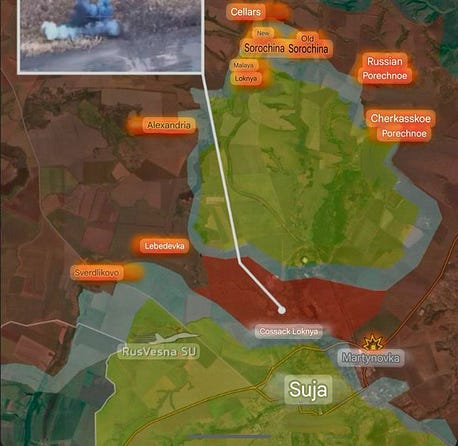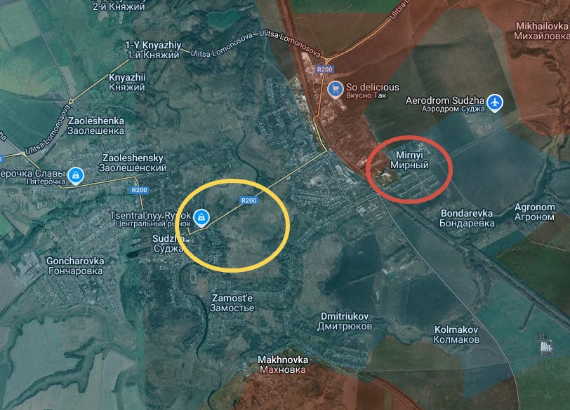 D'autres rapports indiquent que Mirnyi et les environs (cercle rouge) sont en train d'être nettoyés ou sont déjà entièrement capturés, tandis que les forces russes s'infiltrent déjà dans les parties orientales de Sudzha (cercle jaune) :