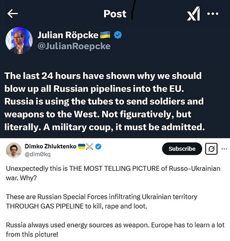 Mais le plus grand fait saillant des événements en cours ces derniers jours a été l'infiltration du gazoduc désormais légendaire, qui aurait été menée par des éléments des groupes suivants :