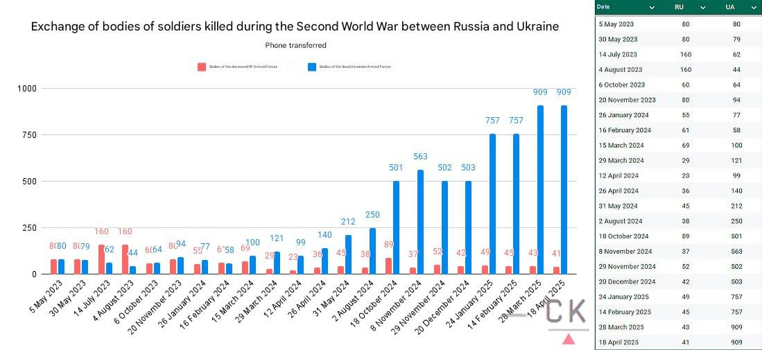 Le 18 avril, un nouvel échange de corps de militaires tombés au combat a eu lieu dans la zone SVO entre la Russie et l'Ukraine. L'Ukraine a reçu les corps de 909 militaires tombés au combat, la Russie 41.