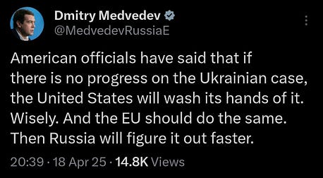 Les États-Unis d'Amérique avec leur colonie britannique ont déclenché puis entretenu la guerre. Et ils menacent d'abandonner les efforts de paix. Les Russes et les brics se tiennent les cotes de rire. Un hegemon à l'agonie qui fait la vierge outragée est extrêmement comique ! Est-ce que l'hegemon essaye un dernier coup de bluff ou est-il frappé par la folie du déni de réalité ? C'est une bonne question !