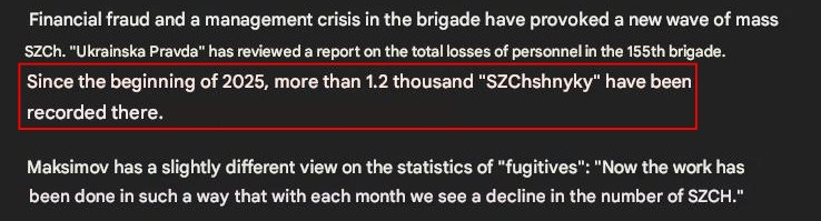 Comme si cela ne suffisait pas, Ukrainska Pravda rapporte également que la 155e brigade mécanisée des FAU – à ne pas confondre avec les indomptables Marines russes – a récemment connu de graves problèmes, au point d'enregistrer plus de 1.200 cas d'absence sans permission depuis début 2025 :