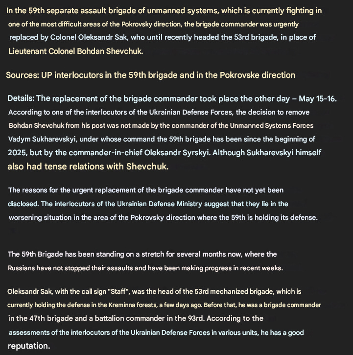 Les médias ukrainiens rapportent que le général Syrsky a limogé brutalement le commandant de la 59e brigade de systèmes sans pilote, qui opère actuellement dans l'un des secteurs les plus critiques et les plus en déclin près de Pokrovsk.