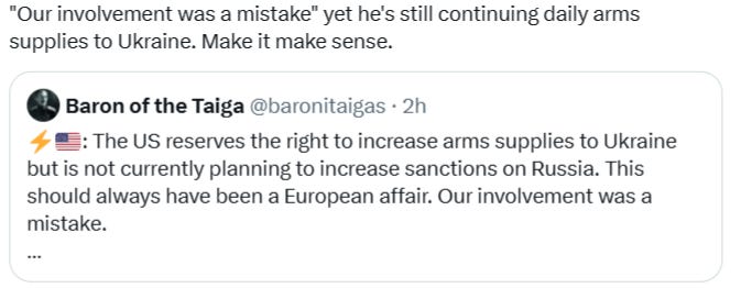 Après tout, comment expliquer autrement l'affirmation de Trump selon laquelle l'implication américaine était une « erreur », alors qu'il continue de fournir des armes à l'Ukraine 24 heures sur 24, 7 jours sur 7 ?Si c'était une erreur, pourquoi continuez-vous à les gaver d’armes et de munitions ? De toute évidence, les États-Unis veulent le beurre et l'argent du beurre : tout en prétendant vivre en paix, ils doivent néanmoins maintenir le couteau sous la gorge de chaque partie pour conserver leur domination.