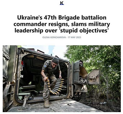 Pire encore, l'article souligne que les désertions ont été encouragées par la corruption généralisée au sein de la brigade, comme en témoigne l'arrestation du commandant du bataillon de drones de la brigade il y a tout juste une semaine, le 11 mai, pour avoir détourné la solde de ses subordonnés :Le SBU et le Bureau d'enquête d'Ukraine ont arrêté la semaine dernière le commandant du bataillon de drones d'attaque de la 155e brigade mécanisée pour avoir exigé des pots-de-vin de ses subordonnés. Ils ont reçu une prime pour être restés en première ligne pendant tout le mois, mais n'y sont restés que partiellement.