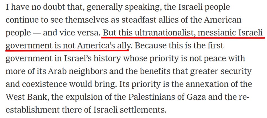Mais ce gouvernement israélien ultranationaliste et messianique n'est pas un allié des États-Unis. Car c'est le premier gouvernement de l'histoire d'Israël dont la priorité n'est pas la paix… Sa priorité est l'annexion de la Cisjordanie, l'expulsion des Palestiniens de Gaza et le rétablissement des colonies israéliennes.