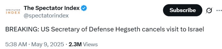 Cela coïncide avec l'annonce de l'annulation du voyage du secrétaire à la Défense Pete Hegseth en Israël :