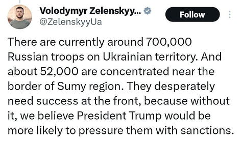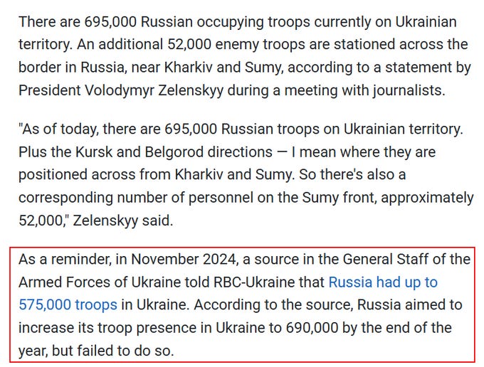 Alors que l’Ukraine continue de saigner à blanc, Zelensky nous a fait le point sur les effectifs russes, affirmant qu’il y aurait environ 700.000 soldats russes en Ukraine, auxquels s’ajouteraient 50.000 soldats supplémentaires juste au-delà des frontières de Soumy et de Kharkov: