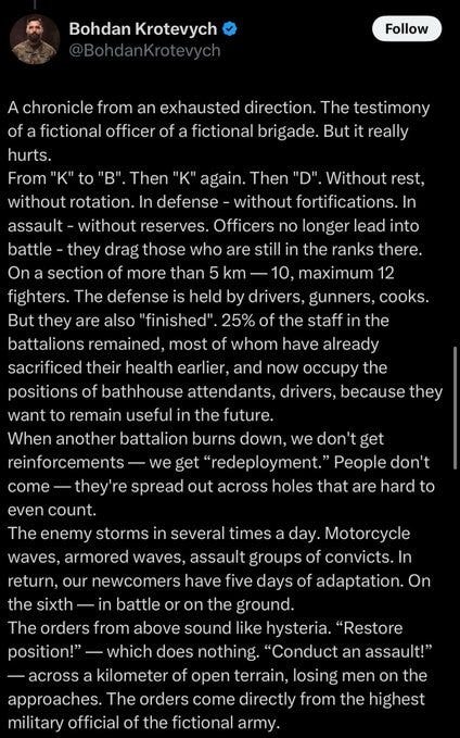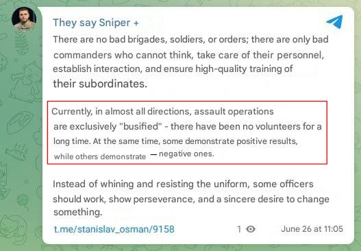 Des officiers ukrainiens ont lancé de nouveaux cris d'alarme concernant le front. Le commandant du peloton d'Aïdar, Stanislav Bouniatov, écrit que dans presque toutes les directions de combat, les opérations d'assaut sont exclusivement menées par des hommes « busifiés », c'est-à-dire des Ukrainiens enrôlés de force par les mobilisateurs, plutôt que par des volontaires motivés :