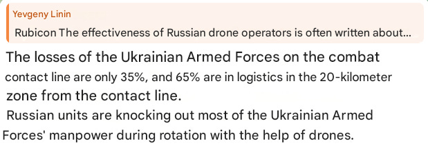 Les drones FPV représentent 49 %, l'artillerie seulement 13,6 %, et les bombes russes Kab/Fab seulement 3,7 %, selon eux. Plus précisément, ils distinguent que 35 % des impacts FPV touchent des troupes en position, comme des tranchées et des trous, tandis que 65 % touchent des routes, c'est-à-dire des véhicules ou des troupes en transit. Pour mémoire, la liste complète dans la colonne de gauche est la suivante : FPV, artillerie, infanterie, mines larguées par drone, mortiers, Kab/Fab et Lancets.