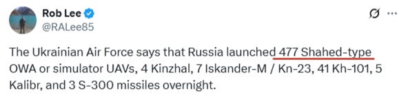 La nuit dernière, la Russie a également lancé l'une des frappes les plus importantes de la guerre, compte tenu du nombre total de moyens utilisés. Le nombre de missiles était relativement faible, mais les drones comptaient près de 500 Shaheds et autres leurres au total, ce qui constitue probablement un record pour une utilisation en une seule journée :