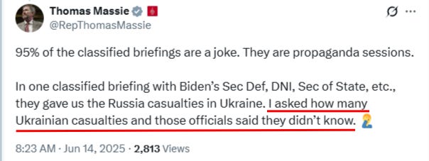 Enfin, j'avais oublié de publier ceci il y a deux semaines, lorsque je l'ai vu pour la première fois, mais c'est assez révélateur. Le député Thomas Massie écrit à propos des réunions classifiées du Congrès auxquelles il a assisté :