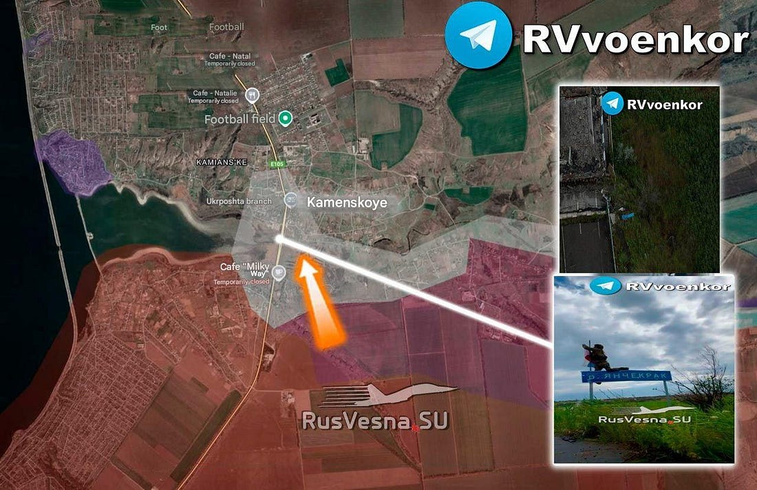 Et comme prévu, quelques jours après ces premiers rapports, les percées russes se poursuivent aujourd'hui. La plus marquante a eu lieu à Kamiansk, sur le Dniepr, où les forces aéroportées russes du 247e régiment ont pris d'assaut le centre-ville et hissé le drapeau :
