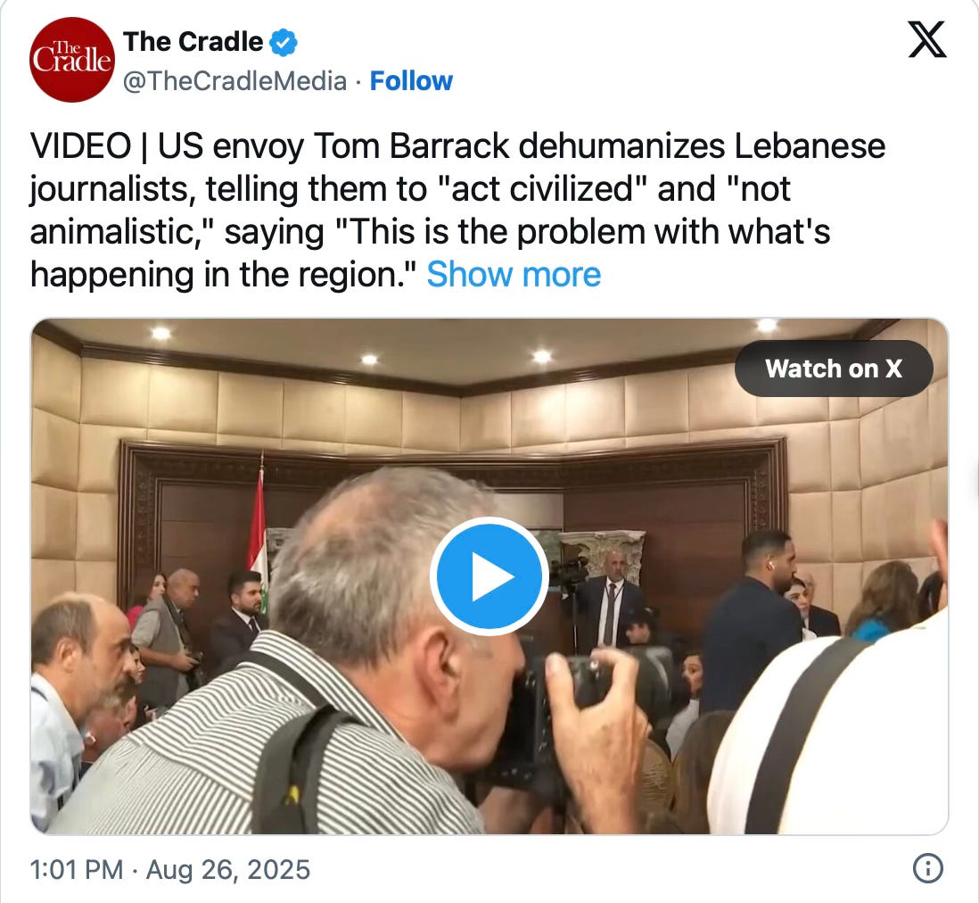 Au lieu d'insulter les Orientaux" bordéliques" qui osent se révolter contre le mépris souverain de Barrack, les soi disant Européens très urbains, très polis, très comme il faut, feraient mieux de s'inspirer de la leçon de fierté que les "bordéliques" Orientaux ont jeté dans la tronche de ce proconsul envoyé par Trump pour soumettre le Liban de la Résistance indomptable!