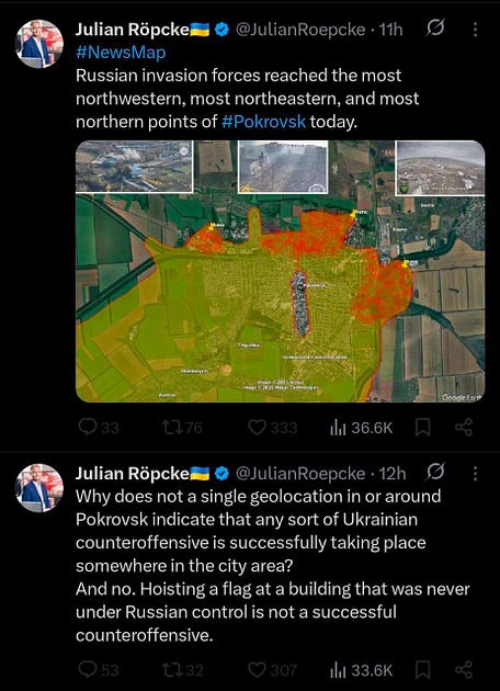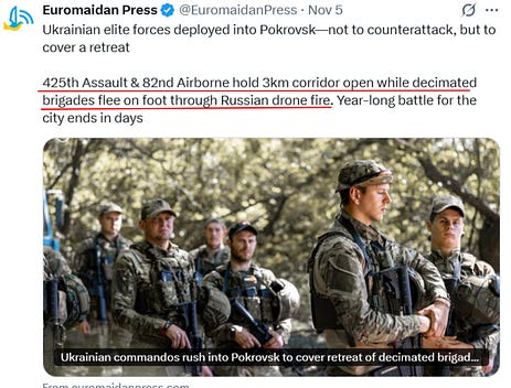 Dans le même temps, nous avons eu cette nouvelle description fascinante des combats à Pokrovsk, fournie par Myroshnykov, analyste ukrainien de renom, qui vient encore étayer ce qui précède :