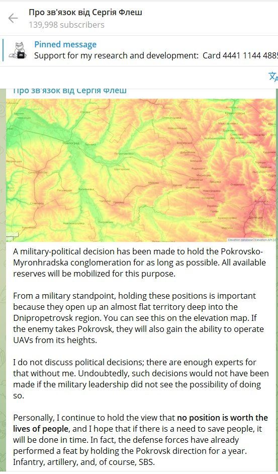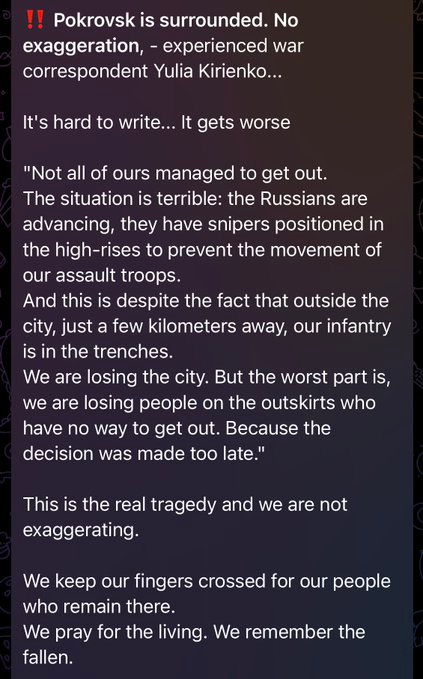 Dans tous les cas, Serhiy « Flash » Beskrestnov, expert reconnu de l'AFU, rapporte qu'une décision aurait été prise de conserver Pokrovsk à tout prix, car la chute de la ville ouvrirait une vaste étendue de plaines que la Russie pourrait facilement contourner en direction de Pavlograd et au-delà :