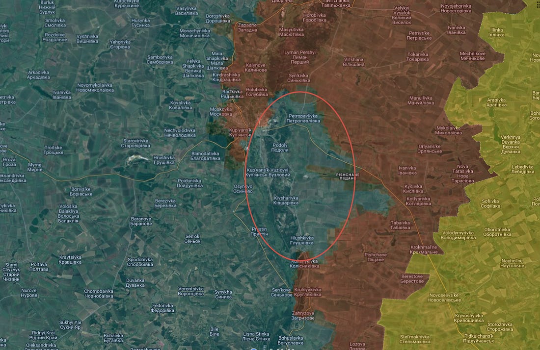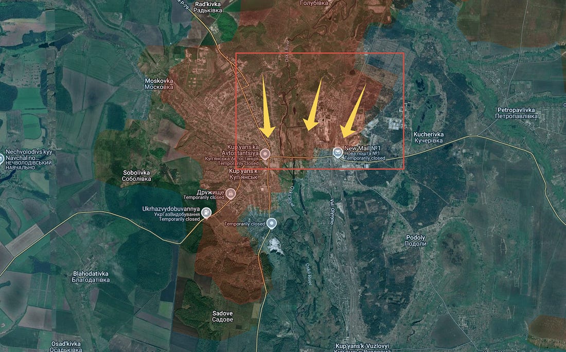 Enfin, le secteur de Kupyansk a de nouveau connu de fortes avancées, les forces russes déferlant du nord sur la rive orientale et s'emparant d'une grande partie de celle-ci :
