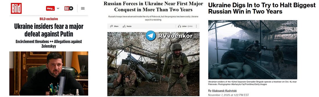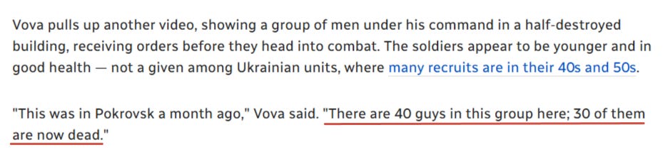 D'autres communiqués de presse occidentaux récents dressent un tableau poignant des pertes ukrainiennes à Pokrovsk, contredisant ainsi les affirmations selon lesquelles la Russie subirait le plus gros des pertes. La chaîne canadienne CBC cite un commandant ukrainien qui déclare que 75 % de ses hommes sont morts au cours du seul mois dernier.