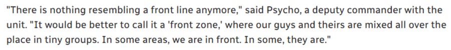L'autre aspect intéressant de l'article de CBC est la description des combats, qui fait écho à ce que j'ai récemment écrit dans l'article payant , à propos de cette nouvelle réalité de la guerre à laquelle nous assistons.