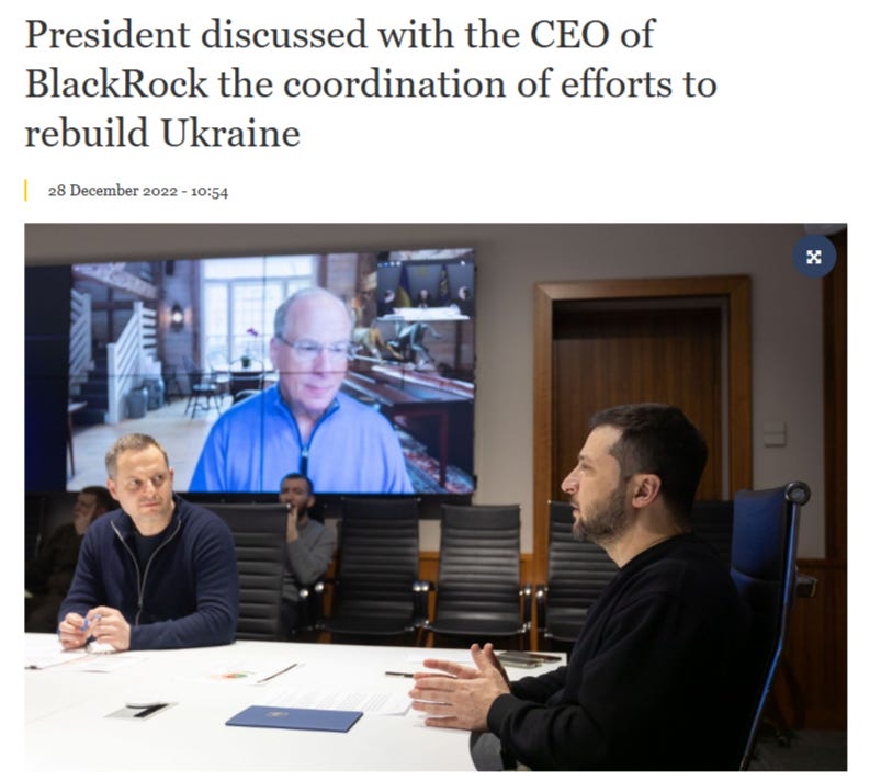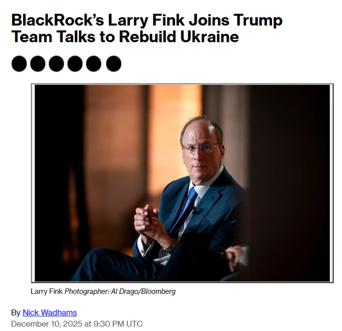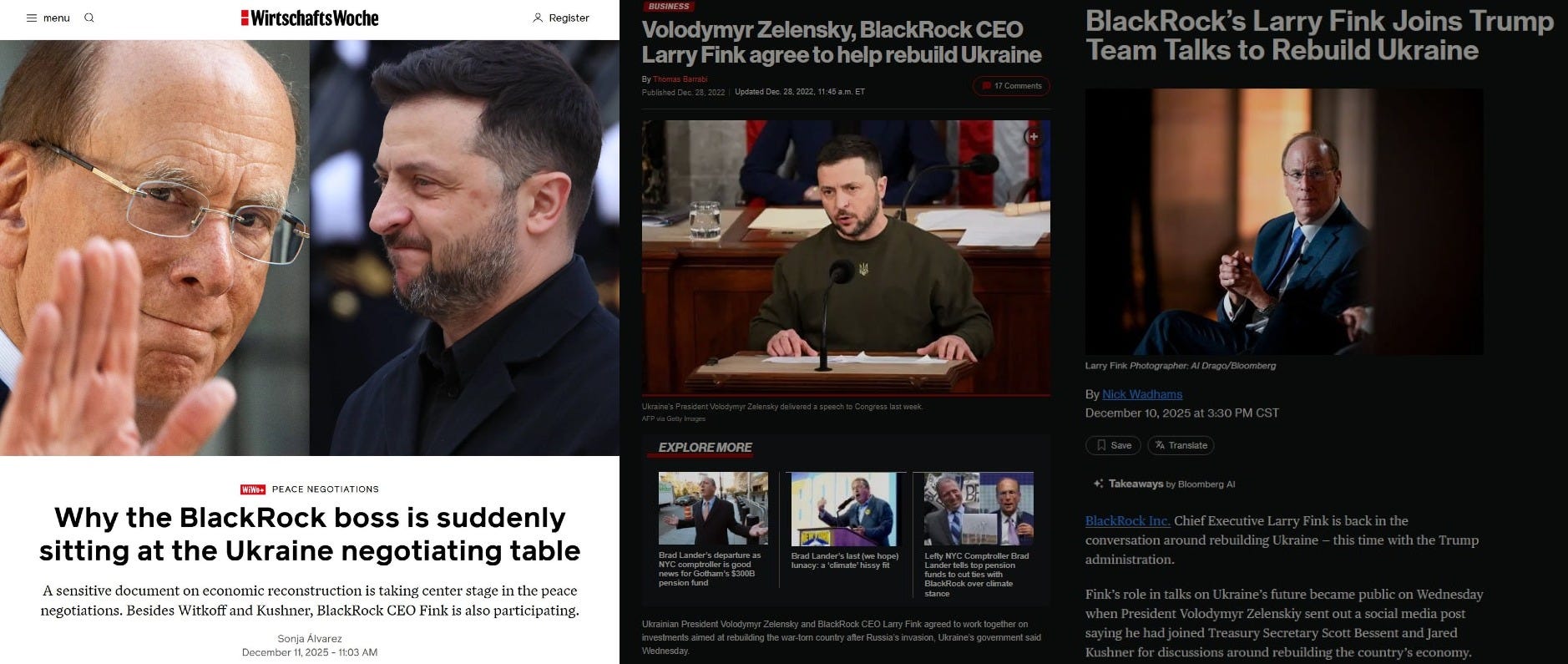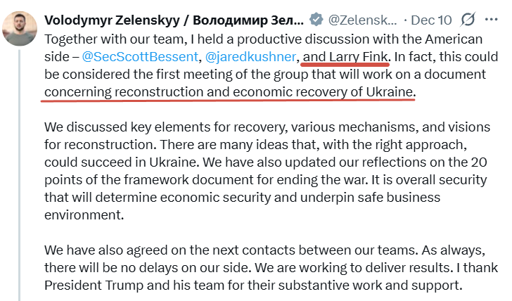 Longtemps, les sceptiques ont raillé les aspects les plus spéculatifs des théories du complot concernant « BlackRock » et l'Ukraine — selon lesquelles BlackRock aurait joué un rôle déterminant dans la vente et le pillage des actifs du pays, etc. Aujourd'hui, il semble que ces rumeurs aient atteint un aboutissement absurde, puisque Zelensky lui-même a publié le contenu d'une réunion avec Witkoff, Kushner et Larry Fink — par visioconférence — sur la « reconstruction de l'Ukraine » :
