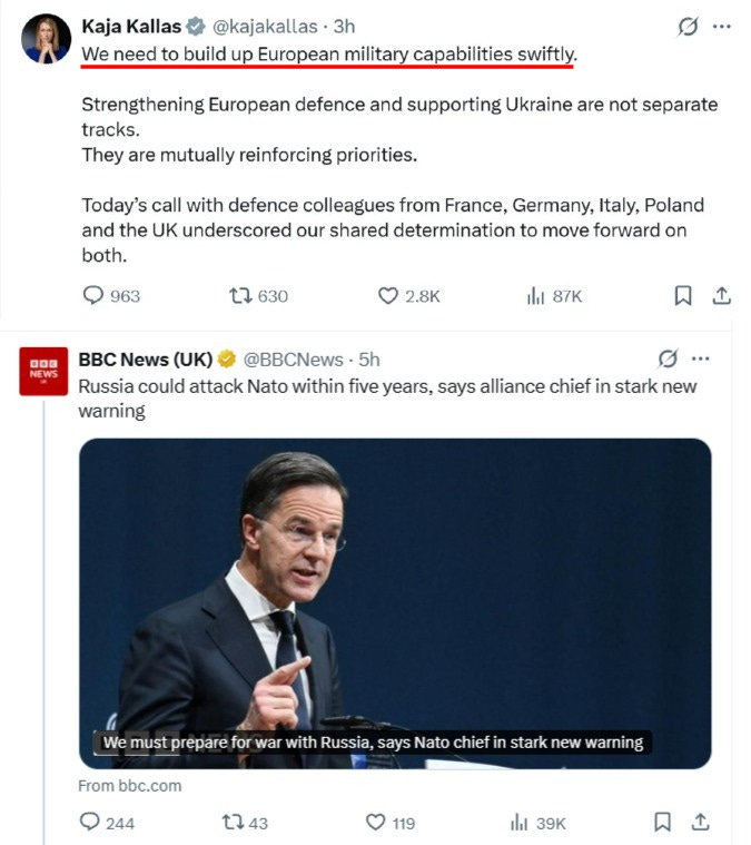 La journée a commencé par une nouvelle salve de discours alarmistes et hystériques de la part de l'hydre totalitaire OTAN-UE. Rutte a déclaré d'un ton sombre que la Russie avait apporté la guerre à l'Europe et que les Européens devaient se préparer à une guerre d'une ampleur comparable à celle qu'ont subie leurs « grands-parents » pendant la Seconde Guerre mondiale.