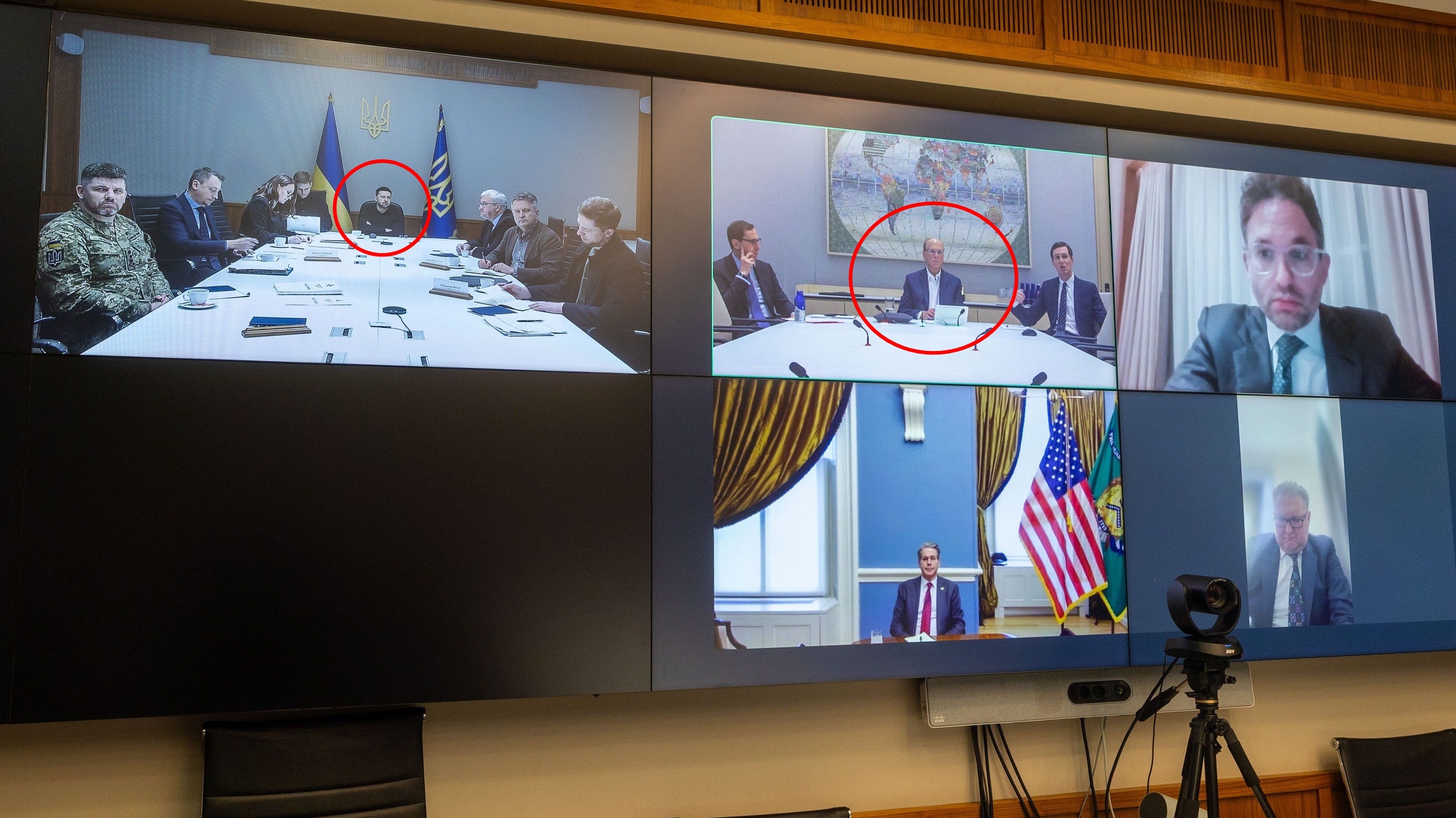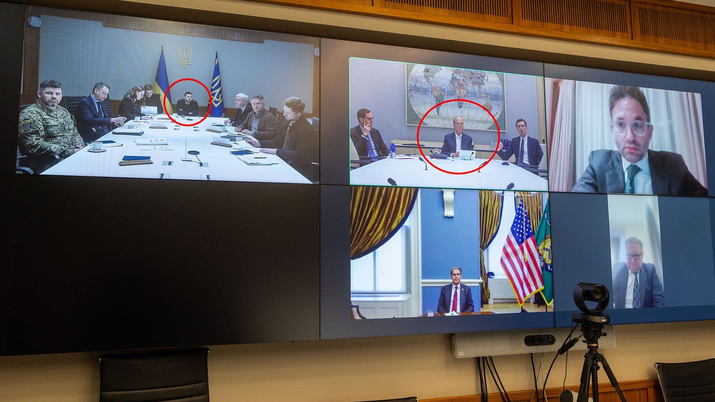 Voici le message en question publié par Zelensky sur les réseaux sociaux, Fink supervisant le déroulement de l'appel vidéo :