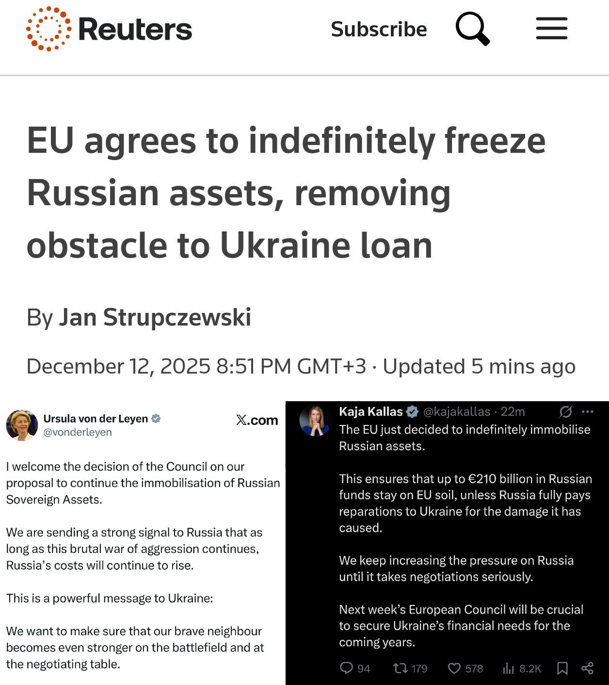 Le même jour, la mafia bruxelloise a franchi l'ultime étape de son autodestruction en votant illégalement pour modifier la condition d'unanimité concernant la restitution des « avoirs gelés » russes, afin de les geler indéfiniment et de servir de filet de sécurité aux « réparations » ukrainiennes. Elle a procédé ainsi en invoquant une clause relative aux « urgences économiques », prétextant en substance que l'UE subit de graves dommages économiques du fait de la « guerre menée par la Russie ».