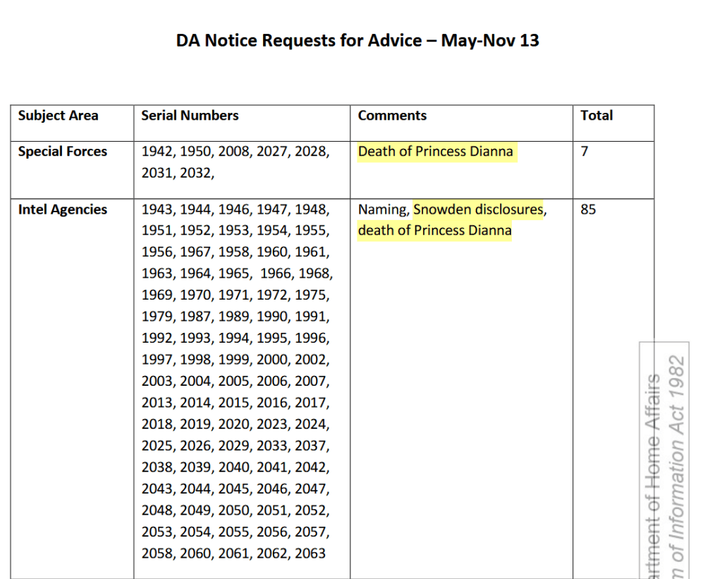 Entre mai et novembre 2013, sept demandes concernant les « forces spéciales » ont été déposées en lien avec le décès de la princesse Diana en août 1997. Fait incroyable, pas moins de 85 demandes émanant d'« agences de renseignement » ont été recensées suite à la mort de Diana et aux révélations d'Edward Snowden, informateur de la NSA. Preuve inquiétante de l'inefficacité du Comité DSMA, les médias britanniques ont quasiment ignoré l'article du Guardian sur les fuites de Snowden.