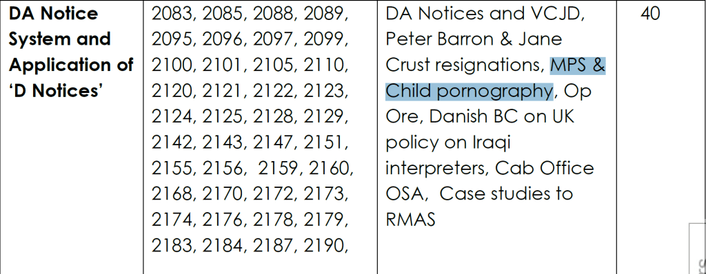 Enfin, le document recense les demandes formulées entre novembre 2013 et mai 2014. Celles-ci incluaient à nouveau les « révélations de Snowden », ainsi que les liens entre la police métropolitaine et la pornographie infantile, et l'opération Ore. Cette dernière avait conduit à l' arrestation de milliers de personnes au début des années 2000, accusées d'avoir téléchargé du contenu pédophile. Cependant, nombre d'entre elles ont été innocentées, de nombreuses poursuites ont été abandonnées, des dizaines de Britanniques potentiellement accusés à tort se sont suicidés , et une grande partie des preuves ayant servi de base à cette répression s'est avérée vraisemblablement frauduleuse.