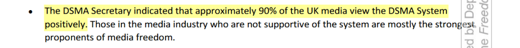 « Le secrétaire de la DSMA a indiqué qu'environ 90 % des médias britanniques ont une opinion positive du système DSMA », indique le rapport, ajoutant que les quelques journalistes dissidents « qui ne soutiennent pas le système » sont « pour la plupart les plus fervents défenseurs de la liberté des médias ».