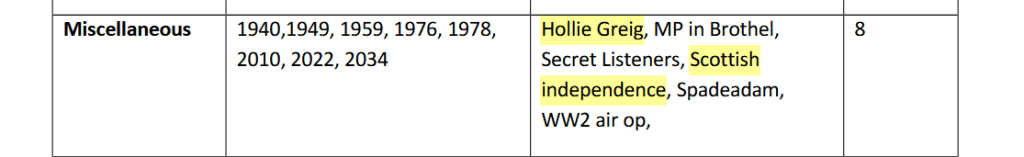 Durant cette période, des demandes « diverses » ont été traitées, notamment la visite d'un parlementaire dans une maison close, l'indépendance de l'Écosse et le cas d' Hollie Greig , une femme trisomique qui affirmait avoir été victime d'un réseau de pédophilie impliquant des personnalités écossaises influentes, dont des policiers, des juges et d'autres personnes importantes. Le décès de trois membres du SAS, victimes d'un coup de chaleur lors d'un exercice d'entraînement en montagne périlleux en juillet 2013, a également fait l'objet d'un « avis » de la commission.