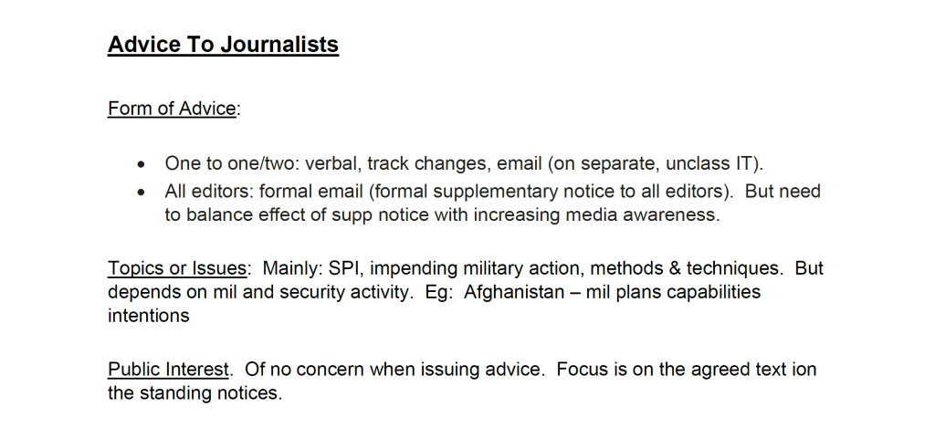 Notamment, dans une correspondance entre le secrétaire de la DSMA et des responsables australiens, le secrétaire a déclaré que l'« interprétation » par les médias de l'objectif du système [D-Notice] était de pouvoir « publier/diffuser les informations qu'ils souhaitent » sans « nuire à la sécurité nationale », impliquant que la presse était chargée de protéger les secrets des agences de renseignement et de l'armée britanniques.