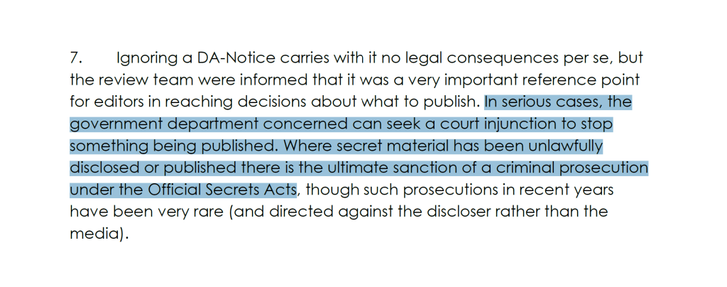 L' examen interne du Comité de 2015 , commandé suite aux révélations d'Edward Snowden, expliquait comment, « dans les cas graves », le gouvernement britannique peut « demander une injonction judiciaire » ou poursuivre les journalistes qui enfreignent les recommandations du Comité en vertu de la loi sur les secrets officiels – un point que le secrétaire de la DSMA, le brigadier Dodds, a souligné lors de réunions avec des responsables australiens. Depuis lors, le Royaume-Uni a adopté de nouvelles lois de sécurité nationale d'envergure , en vertu desquelles les journalistes et les lanceurs d'alerte pourraient également faire l'objet de poursuites.