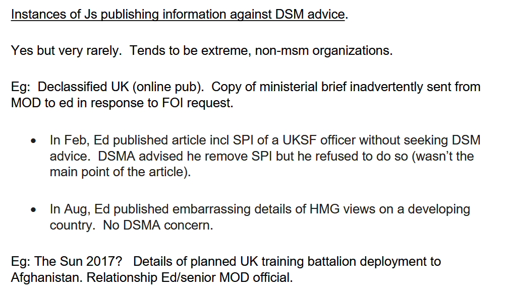 Les documents mentionnent un journaliste qui a subi des pressions l'empêchant de publier des informations concernant une unité de l'armée britannique « sur le point d'être déployée en opérations à l'étranger », dans un pays non précisé. Malgré son obtempération, le journaliste a affirmé que la présence des forces britanniques dans la région était « largement connue » au Royaume-Uni, qu'elle s'inscrivait dans le cadre d'une « opération de coalition internationale de grande envergure » et qu'« il existait des preuves publiques pour le démontrer ».