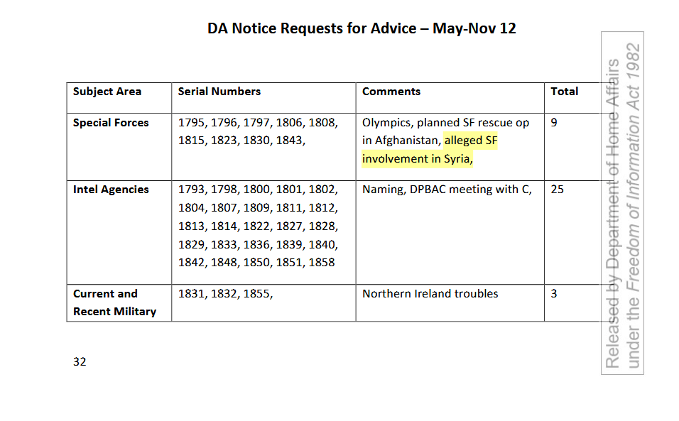 Les documents révèlent également que, de mai à novembre 2011, 29 demandes relatives aux « services de renseignement » ont été déposées. Parmi celles-ci figurait une « implication libyenne », faisant sans doute référence à la capture d'agents du MI6 et du SAS infiltrés dans le pays alors que Tripoli sombrait dans le chaos d'une guerre par procuration orchestrée par l'Occident. Seize demandes concernaient « Wikileaks », ainsi que « D For Discretion », une émission de la BBC consacrée aux activités du Comité DSMA. Il est difficile de déterminer si ces demandes émanent de la chaîne de télévision publique britannique ou de journalistes souhaitant obtenir des directives pour couvrir son contenu.