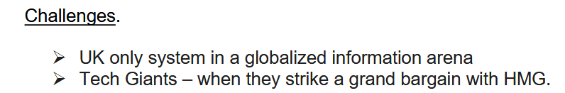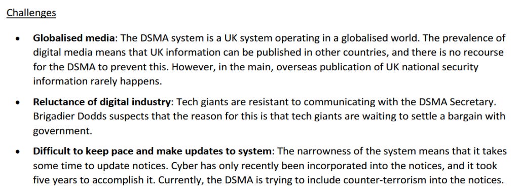 Une note d'information écrite soulignait que le DSMA britannique était le « seul système [de ce type] dans une arène informationnelle mondialisée » et décrivait la nécessité pour les « géants de la technologie » de « conclure un accord global » avec le gouvernement britannique comme l'un de ses « défis » permanents.