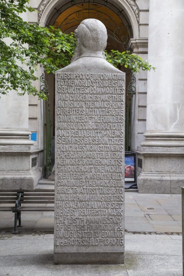Des propos comme ceux tenus par le dirigeant travailliste britannique susmentionné inquiètent les Rothschild, qui, à la fin du XIXe siècle, rachètent l'agence Reuters afin d'exercer un certain contrôle sur les médias. Les autorités, comme à leur habitude, nieront ce fait, mais les Rothschild figurent sur cette statue. Celle-ci célèbre la mission de Reuters en tant qu'agence de presse indépendante et commémore sa fondation en 1851.
