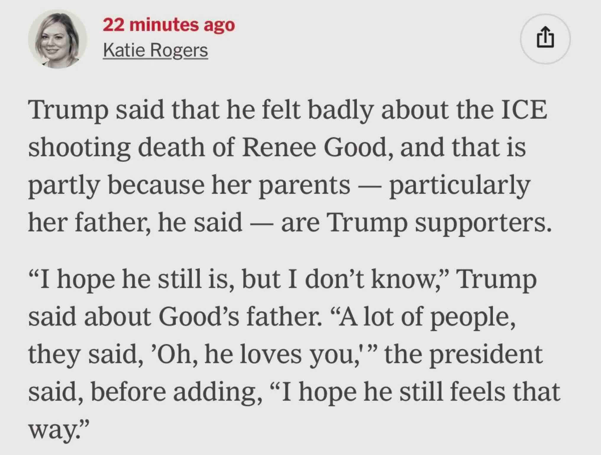 La bonne nouvelle, c'est que Trump, qui avait applaudi l'exécution brutale de Renée Good, mère de deux enfants, par l'ICE, regrette désormais sa mort. La mauvaise nouvelle, c'est que si ce vieux narcissique sénile regrette sa mort, c'est parce que les parents de Good étaient des partisans de Trump.