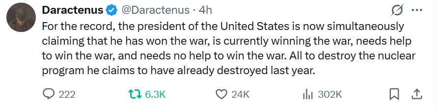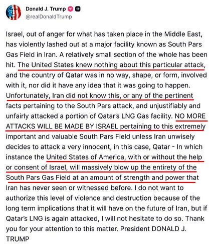 Mais l'élément le plus significatif de cette soudaine polémique est la révélation que les États-Unis n'ont en réalité ni autorisé ni participé à ces frappes israéliennes unilatérales, contrairement aux premières informations qui indiquaient une action concertée. Des rumeurs ont circulé tout au long de la journée jusqu'à ce que Trump le confirme lui-même dans un coup de gueule sur les réseaux sociaux, où il semblait fustiger Israël pour son impudence, tout en menaçant l'Iran de nouvelles destructions barbares.