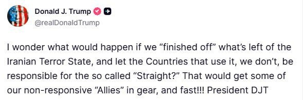 Pendant ce temps, Trump a continué à faire des volte-face grotesques, tel un poulet sans tête, affirmant tour à tour que les États-Unis pouvaient à eux seuls libérer le détroit, puis prétendant que les États-Unis allaient en fait se désengager et laisser le problème être réglé par ceux qu'il affecte le plus.