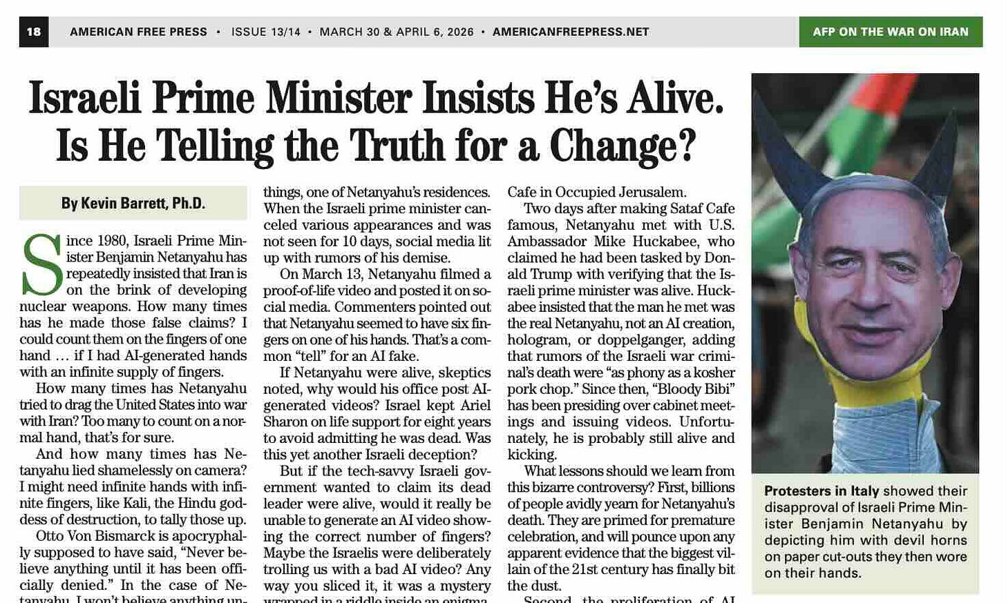 Deux jours après avoir popularisé le Sataf Café, Netanyahu a rencontré l'ambassadeur américain Mike Huckabee, qui a affirmé avoir été chargé par Trump de vérifier que le Premier ministre israélien était bien vivant. Huckabee a insisté sur le fait que l'homme qu'il rencontrait était le véritable Netanyahu, et non un avatar d'intelligence artificielle ou un hologramme, ajoutant que les rumeurs concernant la mort du criminel de guerre israélien étaient « aussi fausses qu'une côtelette de porc casher ». Depuis, « Bibi le Sanglant » préside les réunions du cabinet et publie des vidéos. Malheureusement, il est probablement toujours en vie et en pleine forme.
