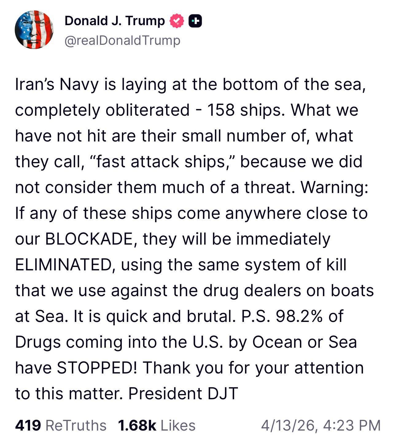 Peu de temps après, il a de nouveau affirmé que la marine iranienne était complètement détruite, à l'exception d'une seconde marine qui, en réalité, n'était pas détruite car elle ne « représentait pas une menace » :